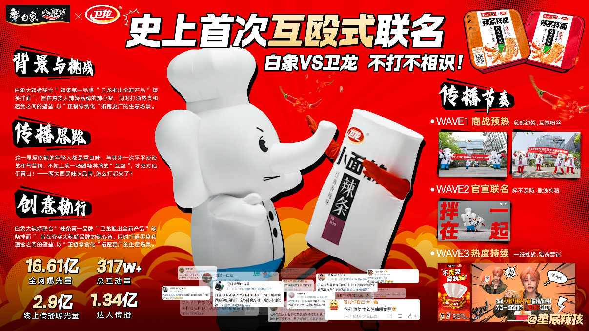 亮点一 · 线下事件线上化:白象x卫龙总部冲突事件让联名变联动,新型商战引发热议,话题阅读量超8300万