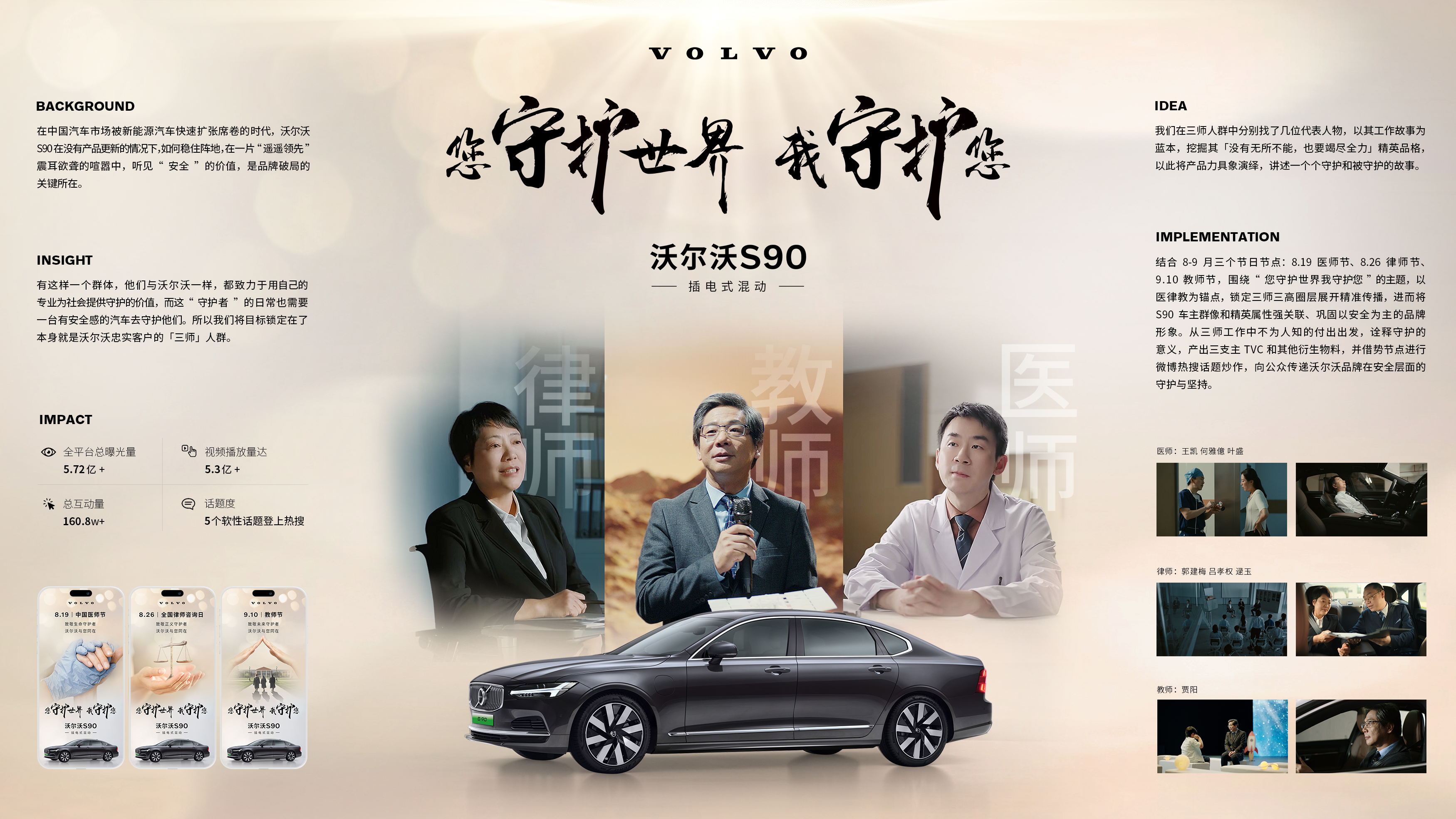 「守护」,是此次传播战役中最重要的符号,也是后疫情时代中,大众最期望得到的价值需求。我们将镜头对准“负重前行”的三师群体,通过深入挖掘并呈现他们的真实故事,展现他们在「守护」社会之外,同样需要「被守护」的时刻。沃尔沃S90,作为这一系列伪纪录片的“隐形主角”,以其卓越的安全性能为这些守护者提供了坚实的出行保障,诠释 “您守护世界 我守护您”的传播主题。