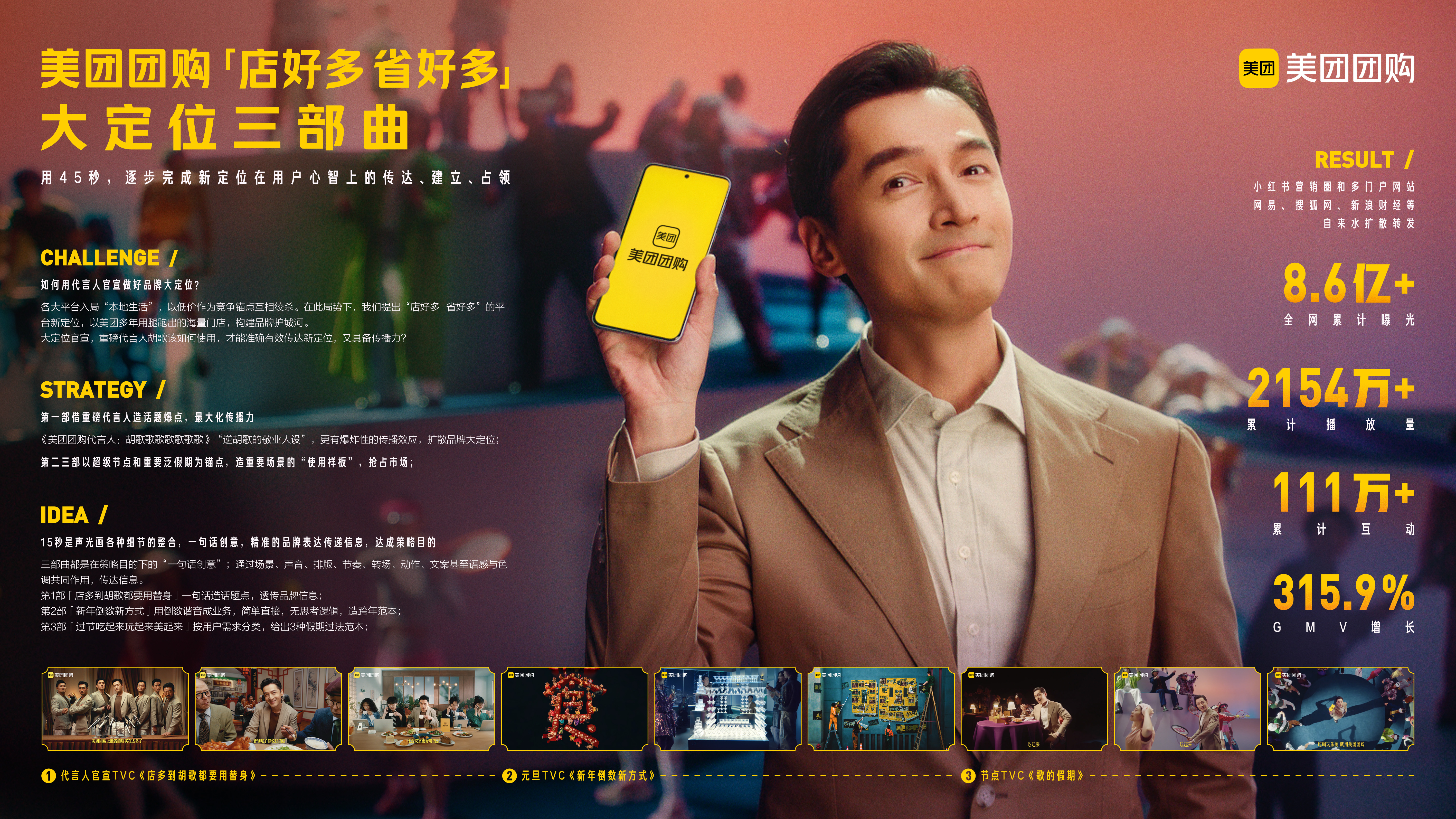 半年内,通过一次重磅身份定位官宣,一次重大节点借势,一次假期过法打样,美团团购x胡歌三部曲 在大面积投放后,在小红书和多门户网站引发广泛转播,全网累计曝光8.6亿+,累计播放量2154万+。并且实打实地带来了业务新增长,GMV增长约315.9%。帮助美团团购在心智上站稳了“店好多 省好多”的新定位。