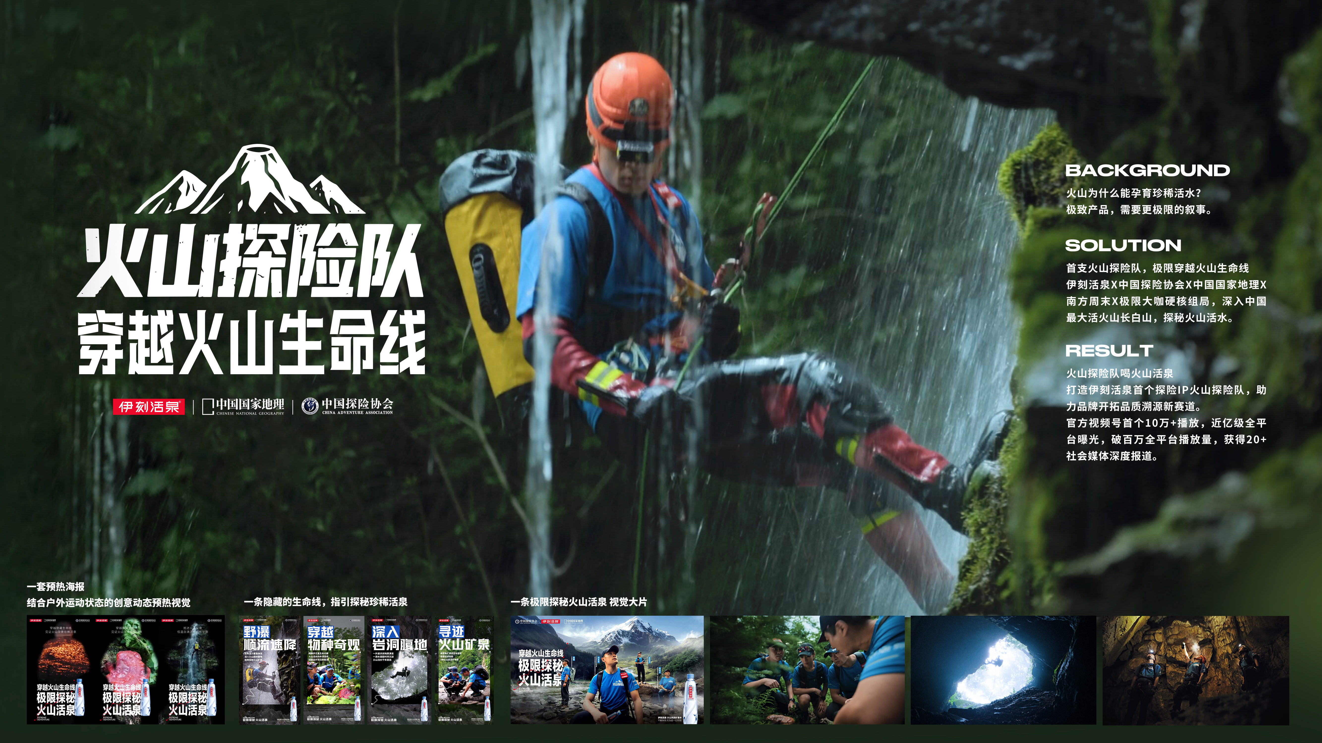 以“火山探险队穿越火山生命线” 为核心叙事,通过主视频纪实性探险风格「穿越火山生命线」呈现跟随伊刻活泉火山探险队伍深入长白山未开发的谷底森林、熔岩洞窟与隐秘瀑布,在呈现珍稀动植物与极限攀瀑、溯溪等动作中,追寻火山生命的踪迹,最终抵达自涌泉眼,强效关联伊刻活泉的产品价值;传播期间配以悬念预告视频、动态海报、探险成员ID视频等多维度传播物料,并通过联合中国探险协会、中国国家地理、南方周末等权威机构背书报道,将这次探险打造为一场跨越夏冬两季、融合专业探索与大众参与的品牌事件,深度传递产品的千般探寻,只为这一口甘甜的核心卖点。