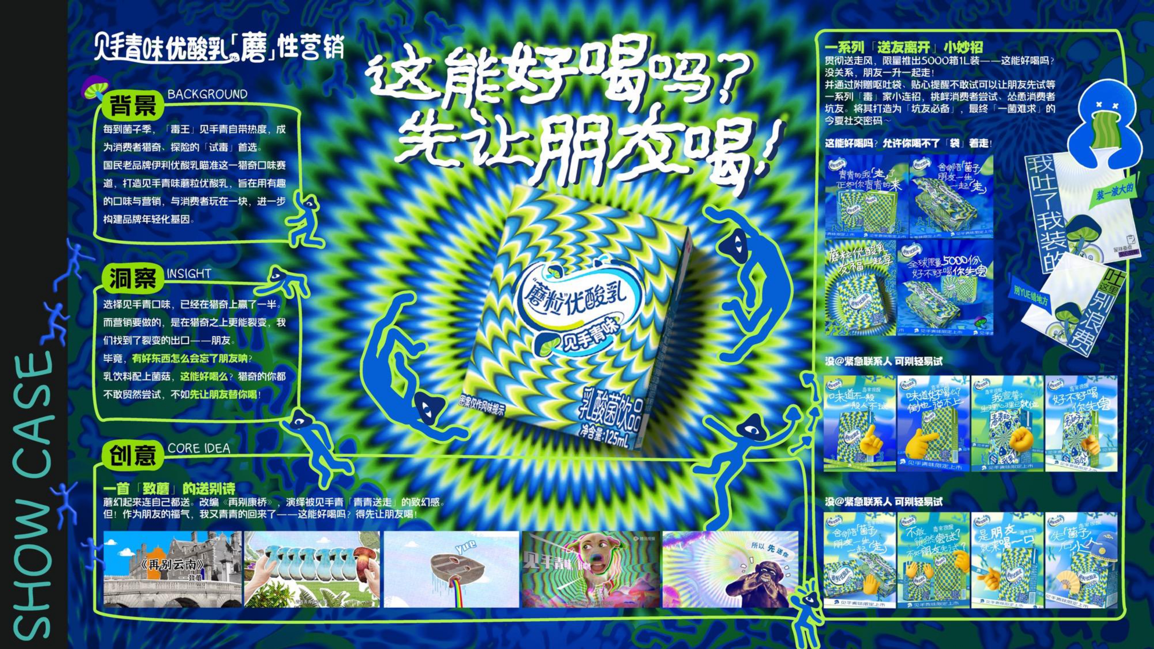 从生意上来说,我们要让产品特质,成为拉进品牌和人群关系的一个核心!通过【朋友的分享欲】来加持魔幻产品的传播,不仅让品牌角色更加适度清晰,也拓宽了猎奇产品的受众以促进购买。毕竟“见小人”只是追求猎奇新鲜的小部分,而更多群体的社交才是让产品自然传播的关键——见手青优酸乳正适合成为「损友的整活儿筹码」!