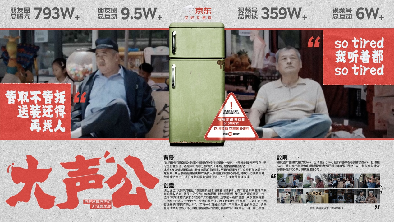 线上通过“大喇叭”喊话,10倍高价回收旧冰箱旧洗衣机,线下结合用户生活中既有的回收站点、居民小区公告栏位等场景,以创意视频+线下有话题的社区广告,透传“京东冰箱洗衣机815周年庆以旧换新,立享国补8折”信息。