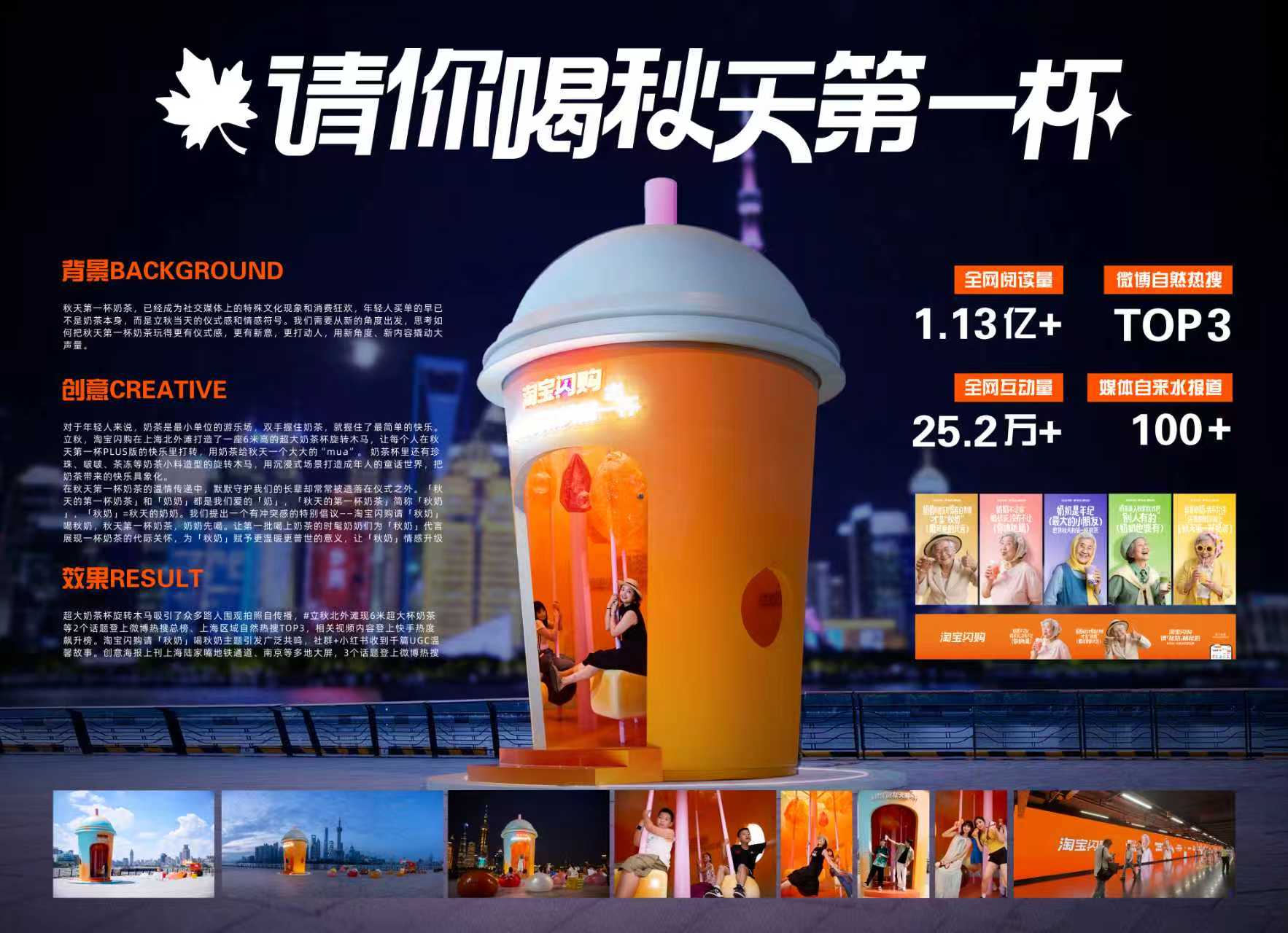 立秋这天,我们和淘宝闪购在上海北外滩,打造了一座6米高的超大杯奶茶旋转木马,打造沉浸式趣味式的线下场景体验,让奶茶杯旋转木马成为北外滩新晋打卡地标,实现了秋奶的社交货币增值,让淘宝闪购和消费者共同建立起一份独特的体验和记忆。
