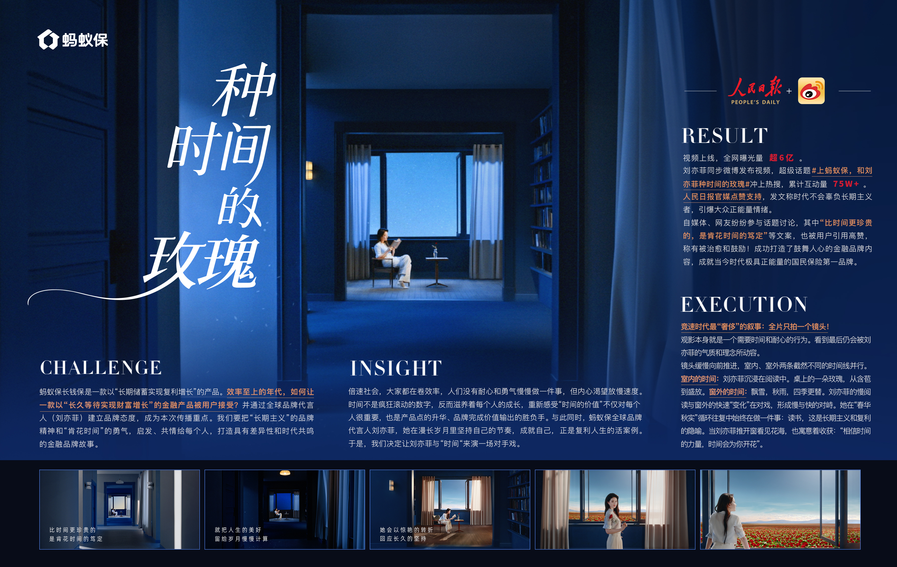 于是,我们通过一个贯穿品牌核心和社会情绪的创意概念“种时间的玫瑰”,充分借助蚂蚁保全球品牌代言人刘亦菲的特质,精准演绎了一则以“时间”为主题的观念广告。