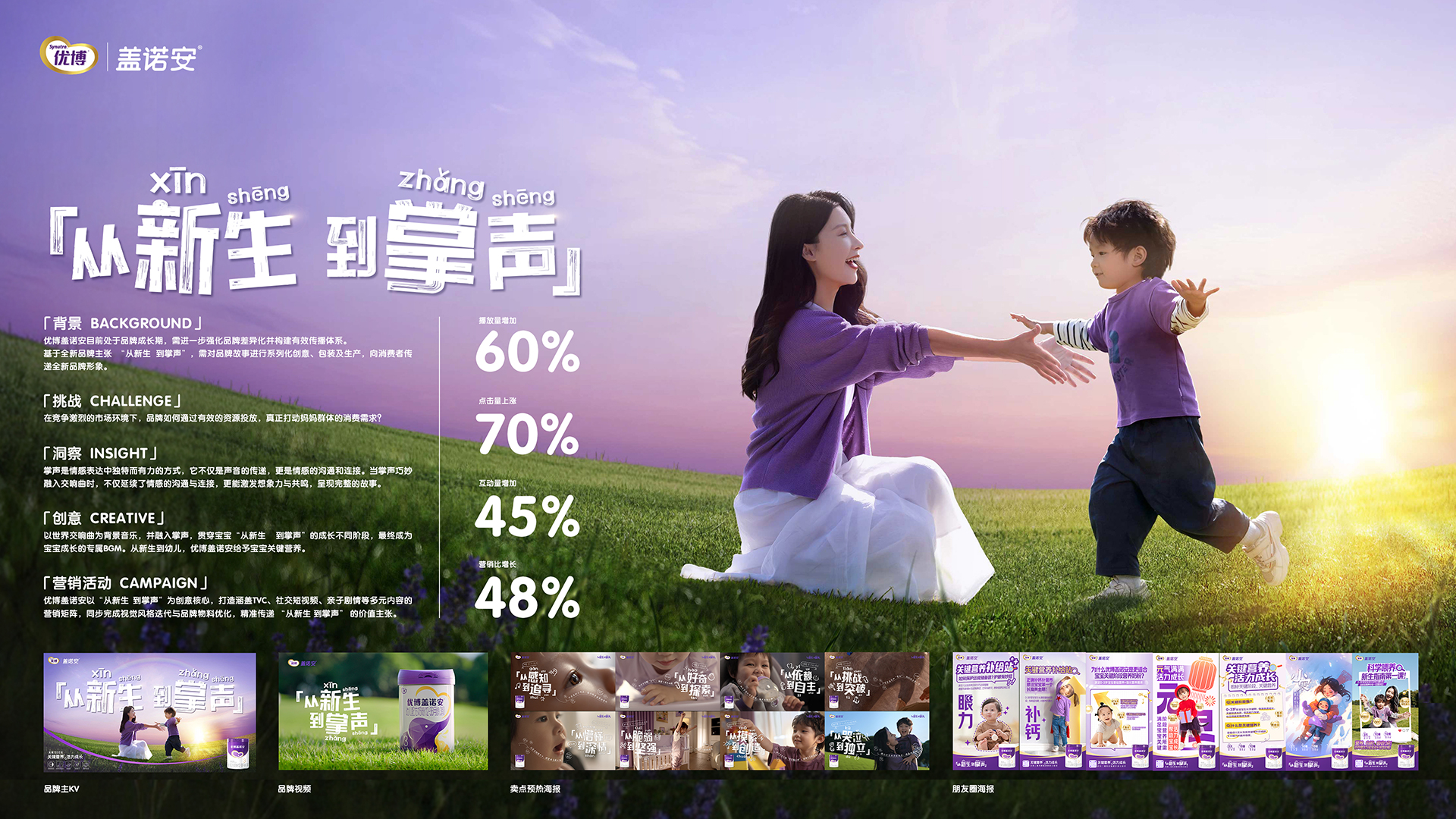 通过“从新生到掌声”的创意表达,优博盖诺安将宝宝成长过程中的高光瞬间具象为“掌声”符号,通过高质感画面演绎亲子之间的情感张力,构建品牌专属的情感资产。项目以此为核心,完成品牌内容的系统焕新,以统一的视觉语言和多元内容形态,传递优博盖诺安以科学营养,全程助力宝宝从新生迈向掌声的价值主张,打造一个既专业可信、又情感共鸣的母婴品牌新形象。