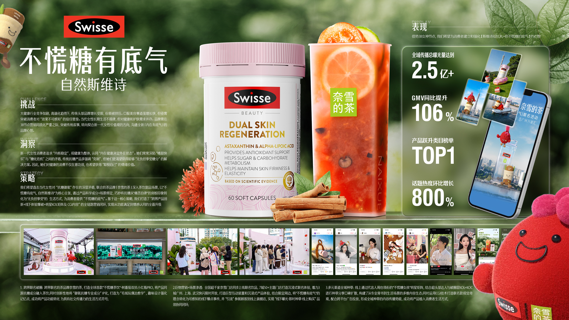 本次campaign 提出「不慌糖有底气」概念,执行周期围绕3.8节点,联名国民潮流饮品品牌,成功打通健康产品与潮流饮品场景的认知壁垒,实现「大健康×潮流饮品」的品效融合。全域传播总曝光量达到2.5亿,相关话题热搜:#斯维诗双抗丸#浏览量增长190%,#斯维诗双抗丸# 热度环比增长800%,小红书域内TI人群规模登顶营养保健行业TOP1,互动量同品类 TOP1, campaign期间主推品天猫站内搜索环比提升200%,销售额提升106%,跃升类目Top1,主推品的新客提升33%。