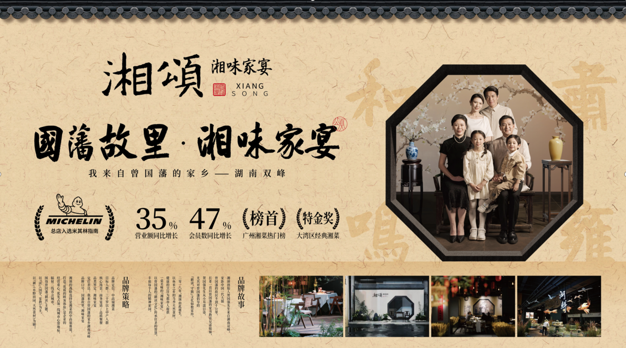 同时,米其林星级作为国际公认的“高品质餐厅”标签,能显著提高餐厅的声誉和知名度,从而帮助顾客快速判断菜品品质和服务质量,降低决策成本。湘颂因其对高标准菜品和服务的一贯追求,连续多年被收录于米其林指南,因此因赛建议将“总店连续四年入选广州米其林指南”作为品牌信任状,吸引顾客进店的同时也为湘颂的高端调性作背书。