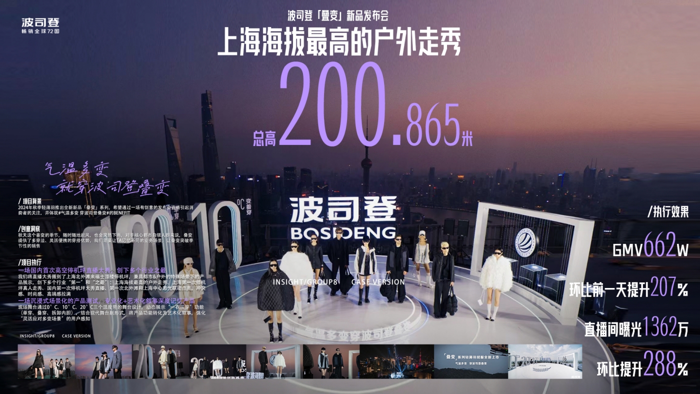 GMV662万,比前一天提升207%;直播间曝光1363万,环比提升288%,我们携手波司登在200.865米高空,成功冲击更高销售实迹!