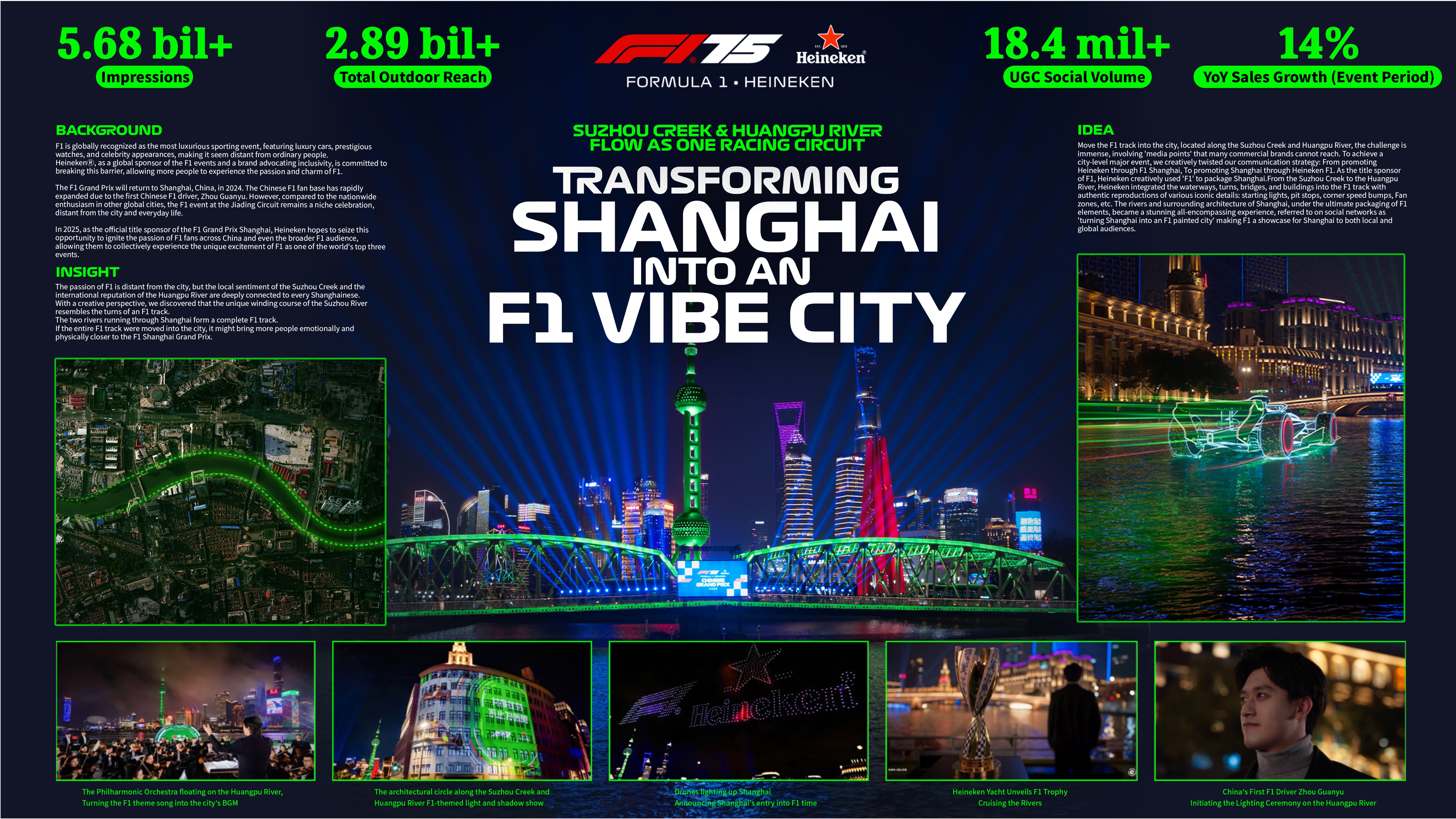 阳狮集团旗下百比赫中国与喜力®啤酒联手打造的"让整个上海变成一座F1之城"案例,以突破性的创意策略和现象级的市场反响,这不仅仅是一次成功的品牌营销,更是一场城市级的创意事件。喜力®啤酒通过颠覆性拉近F1赛事与大众之间的距离,将赛车的激情注入上海的城市脉络,实现了品牌、赛事与城市的深度共鸣。