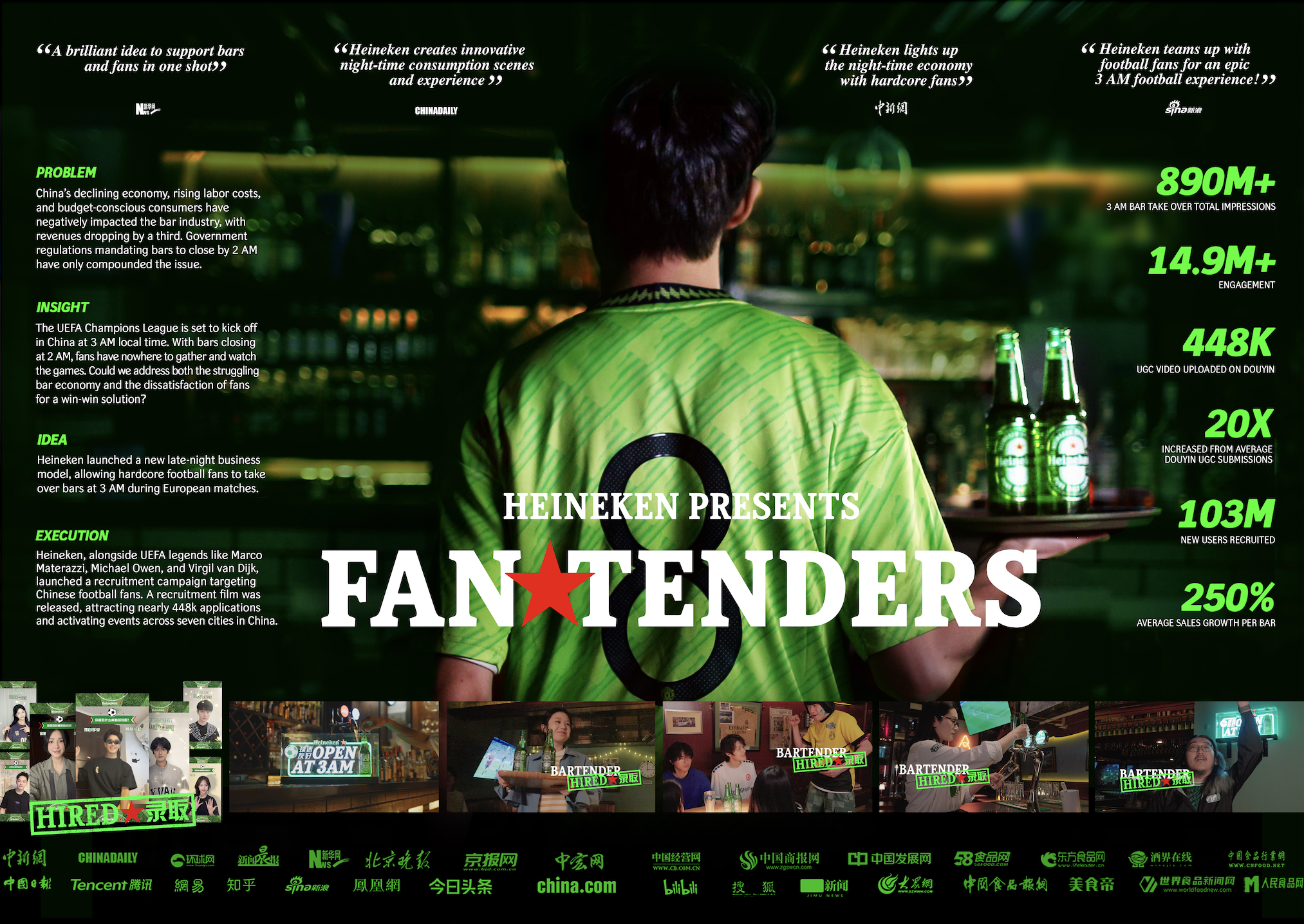 通过抖音,喜力及其全球大使向铁杆球迷发出神秘的面试邀请,鼓励他们以独特的技能申请酒吧的不同角色,最终接管酒吧运营。球迷通过抖音视频模板申请FanTender职位,得票最多的申请者将被“录用”。